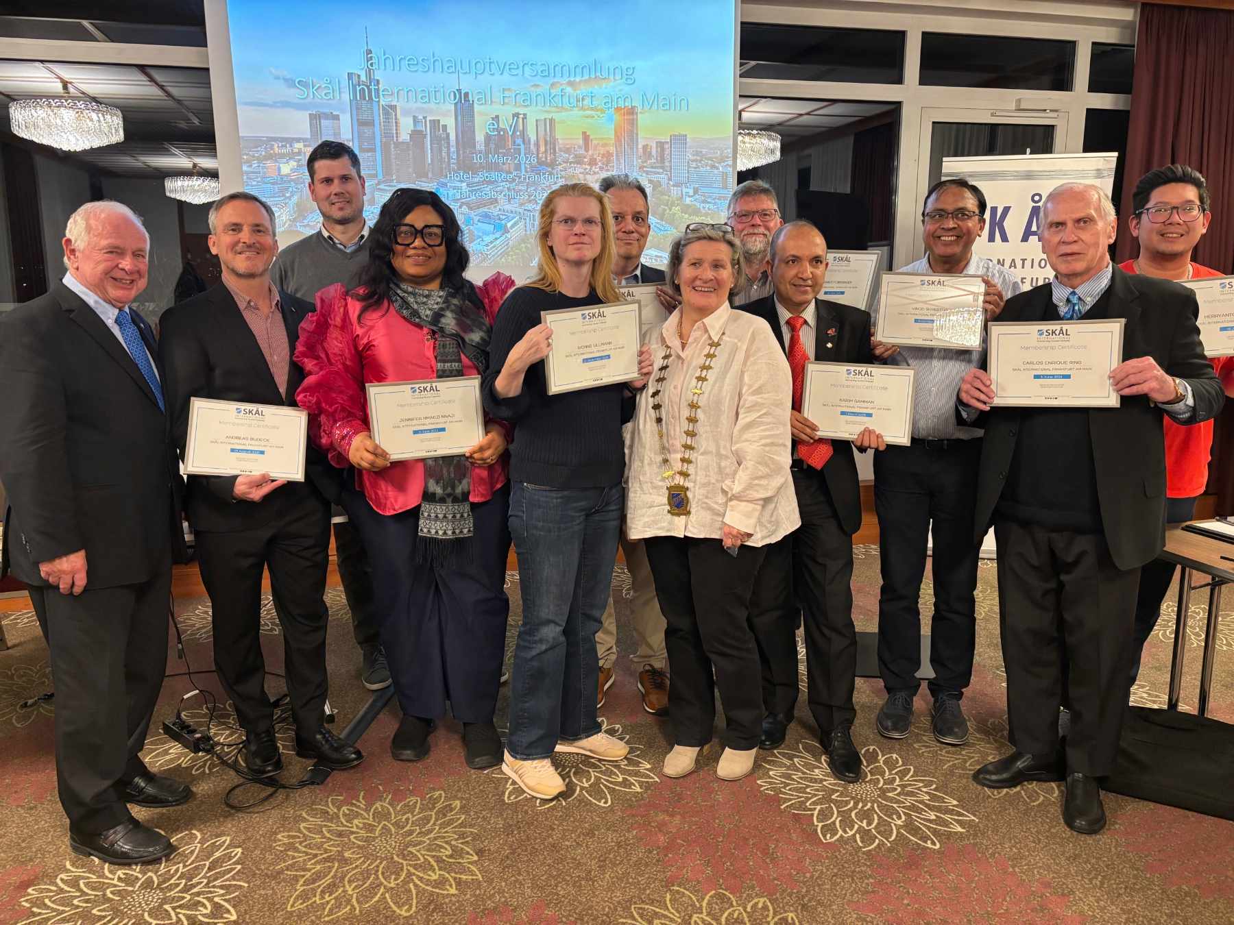Im Rahmen der Jahreshauptversammlung des Skål-Club Frankfurt am 10. März im Frankfurter “Soaltee”-Hotel konnten neun Skålleginnen und Skållegen ihre Mitgliedsurkunden persönlich entgegennehmen. Das jüngste Mitglied des Clubs, Hausherr Karim Samman, hatte krankheitsbedingt leider kurzfristig absagen müssen. Für ihn nahm Hotelmanager Hitesh Bista die Urkunde sowie den Dank des Vorstands entgegen – verbunden mit der Anerkennung für den ausgesprochen angenehmen Aufenthalt in dem messenahen Komforthotel, die herzliche nepalesische Gastfreundschaft und das exzellente Drei-Gang-Menü.